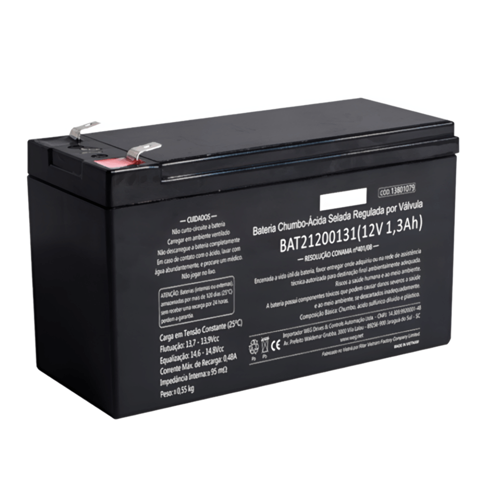 BATERIA ELETROELETRONICA | TIPO: CHUMBO-ACIDO | CARGA: RECARREGAVEL | TENSAO: 12V | CAPACIDADE: 1,3 AH | FORNECIMENTO: INDIVIDUAL | MARCA: WEG | REFERENCIA: BAT21200131